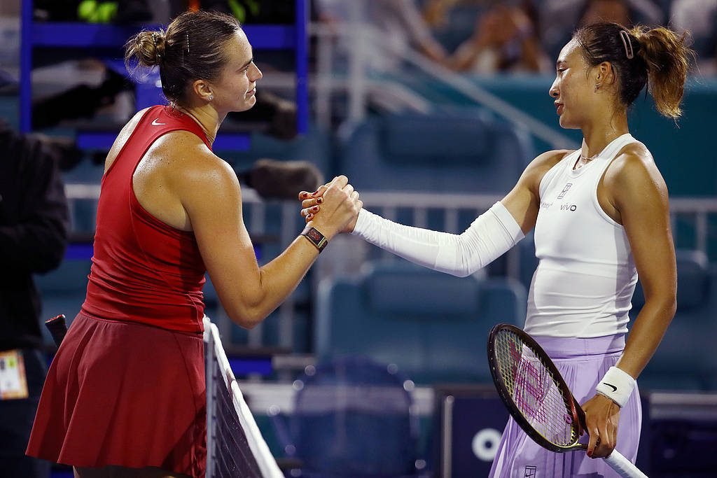 △当地时间2025年3月25日,WTA迈阿密1000赛女单1/4决赛中的萨巴伦卡和郑钦文。